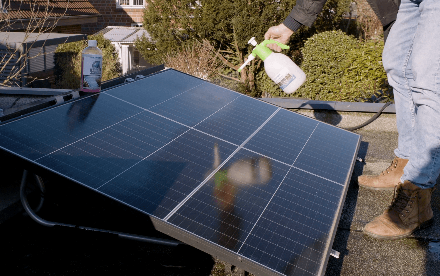 Mit dem DAS BLAUE WUNDER® BALKONKRAFTWERK REINIGER KONZENTRAT pflegen Sie Ihr Balkonkraftwerk mühelos und sorgen für eine stets optimale Energieerzeugung. Regelmäßige Reinigung erhöht die Energieezienz und Lebensdauer der Solarmodule.