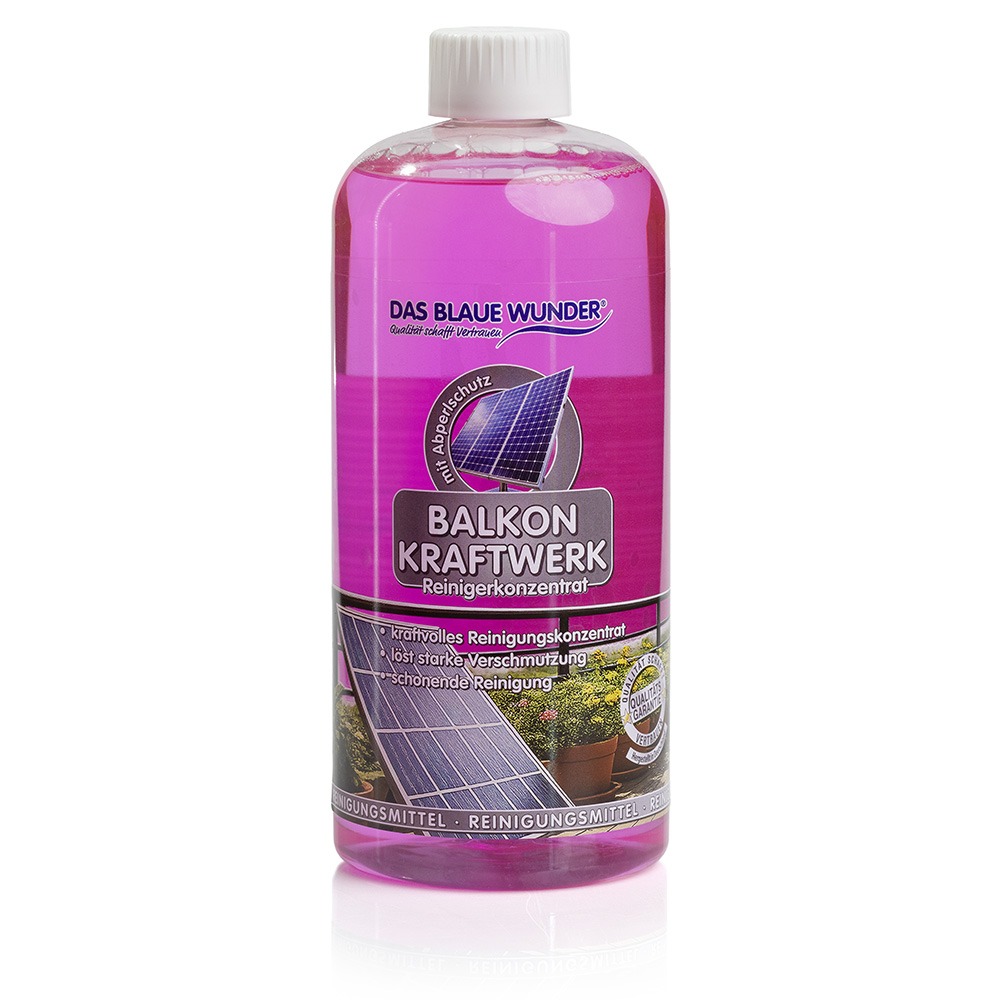 DAS BLAUE WUNDER® BALKONKRAFTWERK REINIGER KONZENTRAT wurde speziell entwickelt, um schonend und effektiv Schmutz von Balkonkraftwerken zu entfernen. Es werden die Anweisungen auf der Verpackung empfohlen, um eine sichere Anwendung zu gewährleisten.