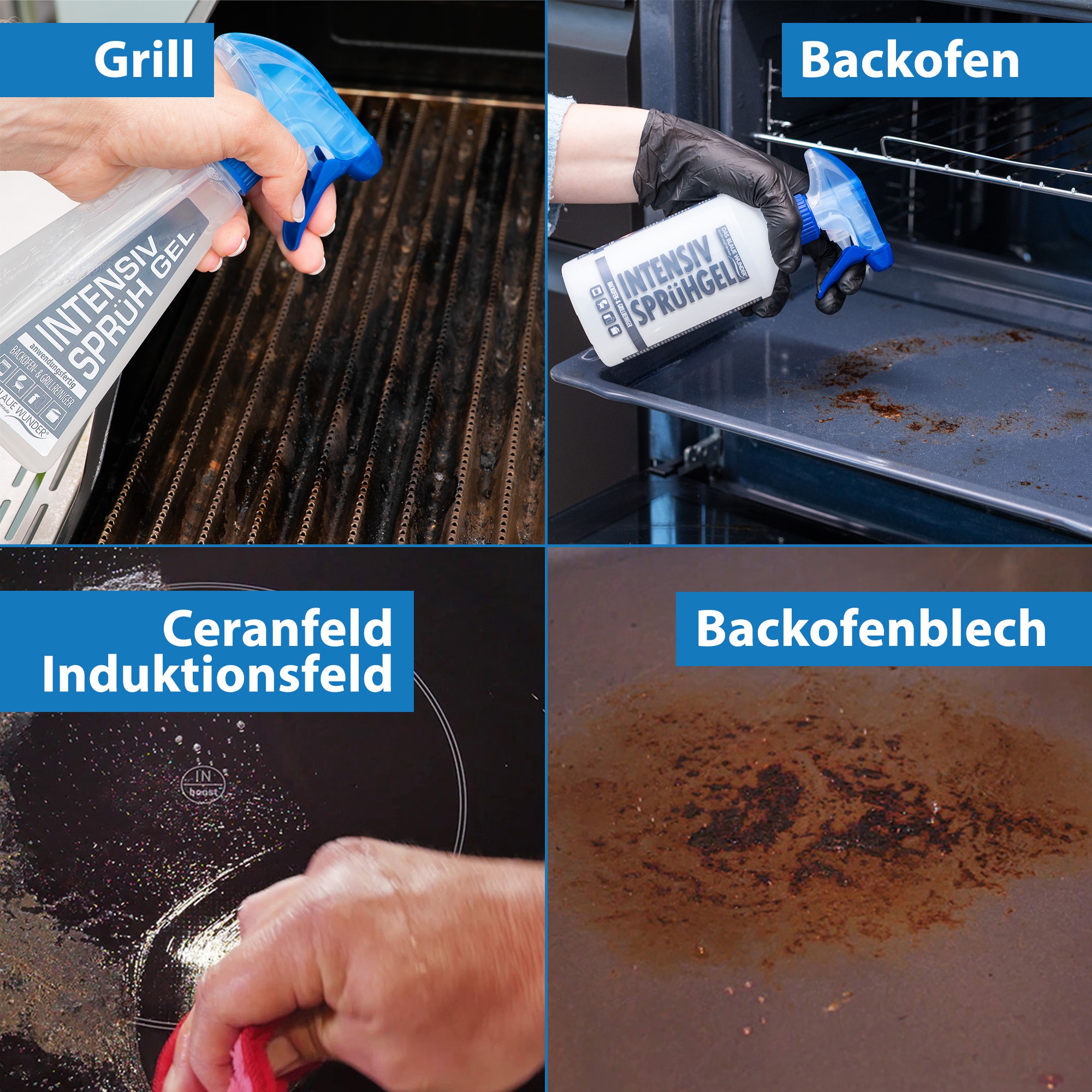 Das INTENSIV SPRÜHGEL löst selbständig und zuverlässig an- und eingebrannte Back-, Brat- und Grillrückstände ohne Scheuern und Kratzen. Dabei ist es frei von Schleifmitteln, Chlor, Phosphaten, Säuren, Lösungsmitteln, Duft- und Farbstoffen. Das INTENSIV SPRÜHGEL beseitigt schnell und mühelos Öle, Fette, Eiweiße, Ruß, Verbrennungs- und Lebensmittelreste, Rauchharz, u.v.m. Das INTENSIV SPRÜHGEL ist kaltaktiv, d.h. ein Aufheizen der zu reinigenden Fläche ist nicht erforderlich.