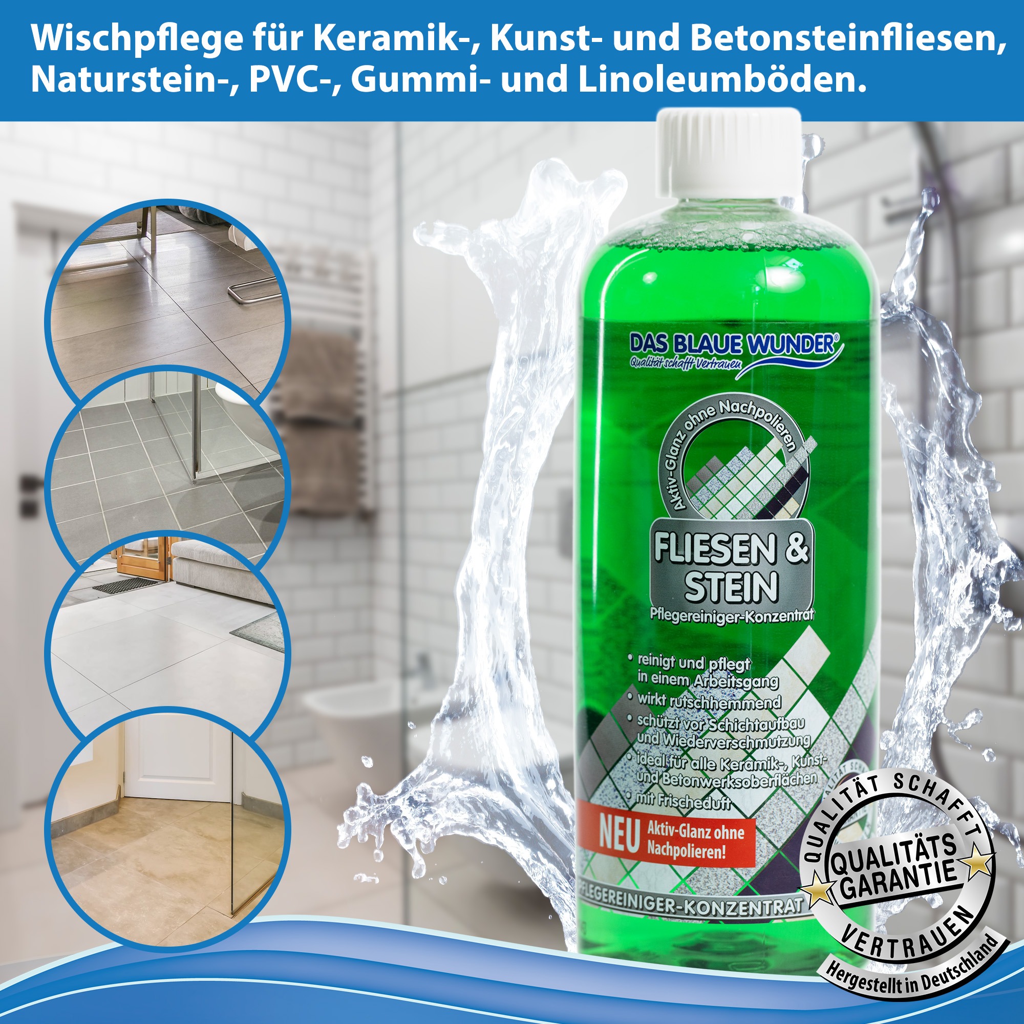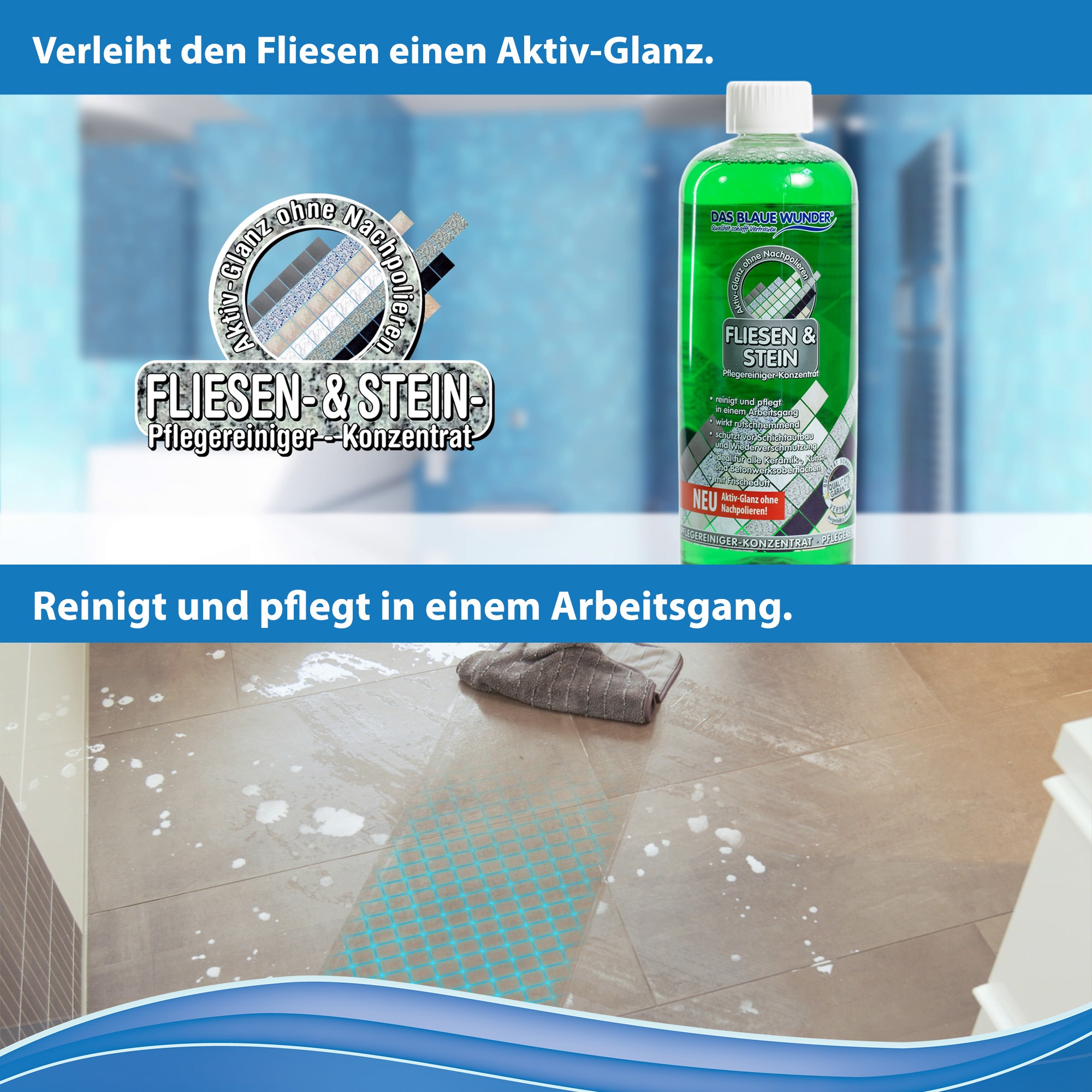Der Fliesen- & Stein-Pflegereiniger wirkt intensiv und hinterlässt hochmolekulare Pflegesubstanzen, die sich bei jeder Anwendung austauschen und selbstständig erneuern. Das schützt zuverlässig vor Schichtaufbau und Wiederverschmutzung und verschönert den Belag, damit Ihre Fliesen länger sauber und glänzend bleiben. Das blaue Wunder Fliesen- und Stein-Pflegreiniger trocknet glänzend und wirkt rutschhemmend – besonders praktisch bei Bodenfliesen.