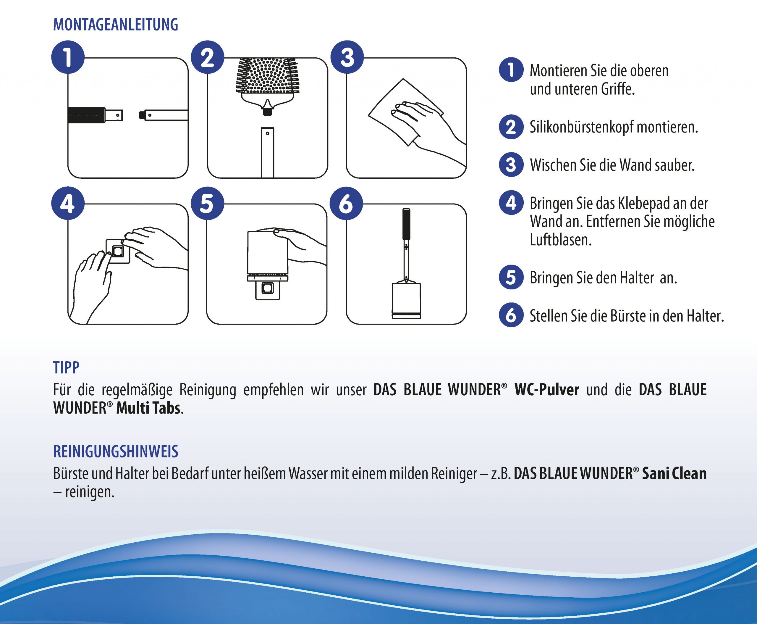 Die flexiblen Borsten der DAS BLAUE WUNDER® WC-Bürste ermöglichen eine gründliche Reinigung – vom Abfluss bis unter den Rand. Selbst schwer erreichbare Stellen sind kein Problem.